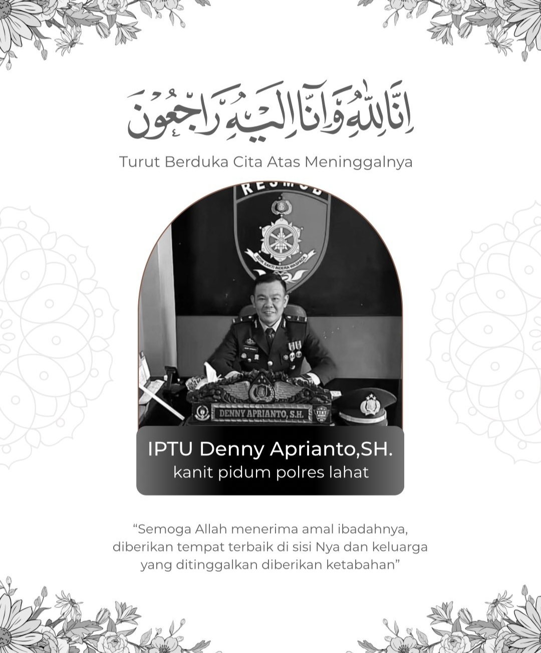 Kepergian IPTU Denny Aprianto, S.H menjadi kehilangan besar bagi Polres Lahat, khususnya Satuan Reserse Kriminal, yang kehilangan salah satu perwira terbaiknya. (Dr)